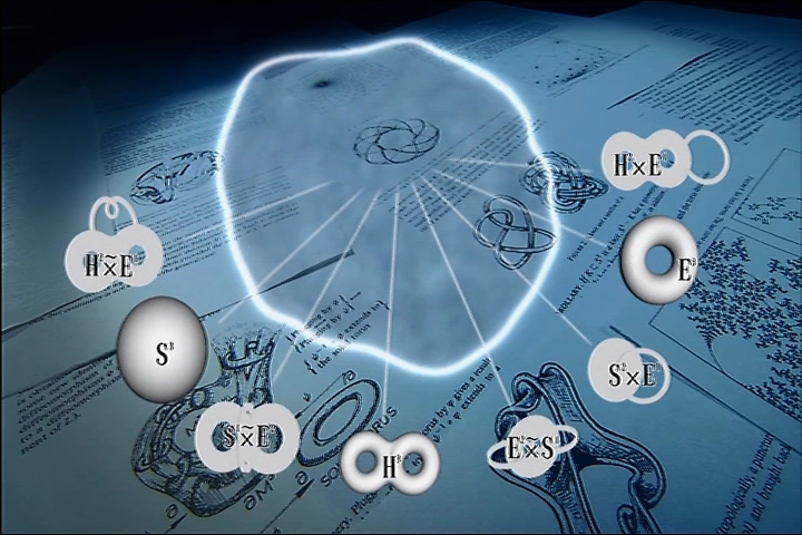 【注】“宇宙がたとえどんな形であろうとも それは必ず最大で8種類の異なる断片から成り立っている”という「サーストンの幾何化予想」は、ポアンカレ予想が解かれる過程で証明されました。(ウィキペディアでは、サーストンの幾何化予想は「コンパクト三次元多様体は、幾何学構造を持つ8つの部分多様体に分解される」と説明されていました。)この図は ポアンカレ予想についてのテレビ番組で使われていたもの。ネット上にアップされていたので お借りしました。